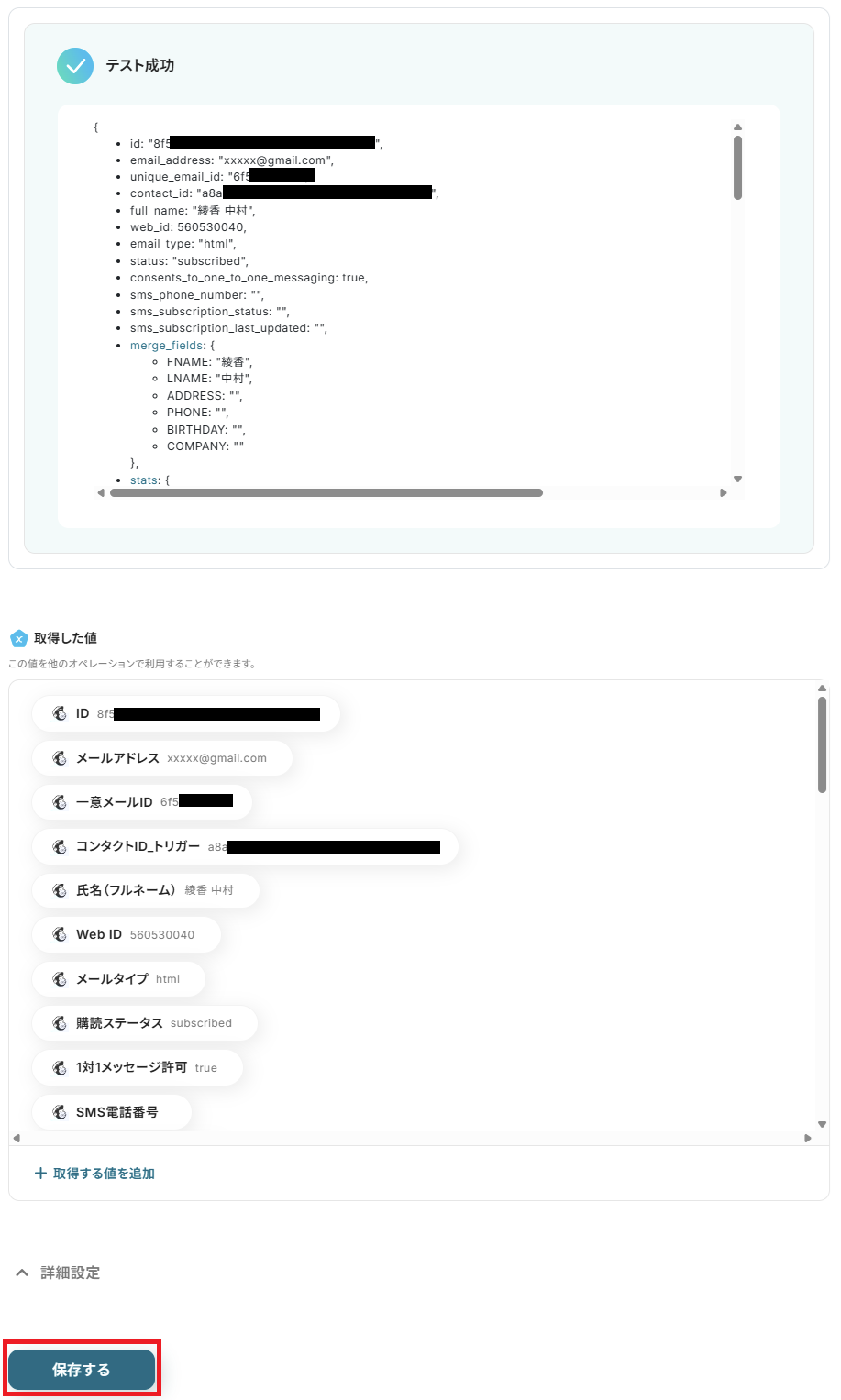 テストが成功すると、Mailchimpに追加した情報が取得されるので、確認したら保存してください。