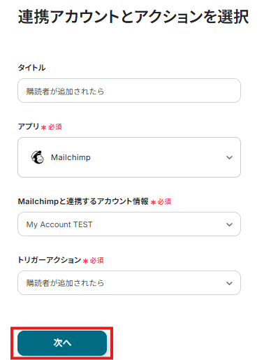 タイトルは、そのままで問題ありませんが、必要であれば変更してください。 アカウント情報を確認します。 トリガーアクションが「購読者が追加されたら」になっていることを確認して「次へ」をクリックします。