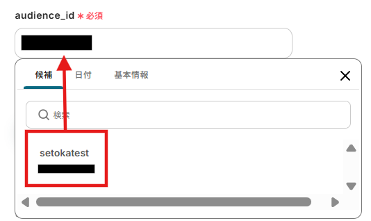 4.「audience_id」は入力欄をクリックし、候補から入力しましょう