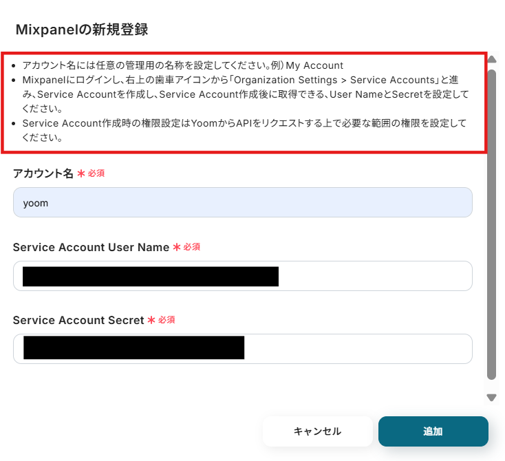 - 「Service Account User Name」と「Service Account Secret」はMixpanelの管理画面から入力します。