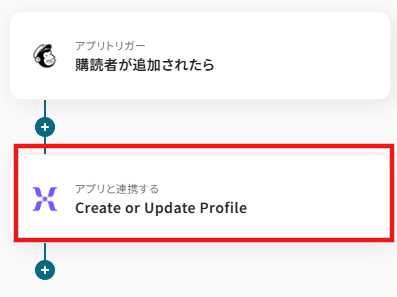 先ほどと同様にタイトルと連携するアカウント情報を任意で設定し、アクションはテンプレート通りに「Create or Update Profile」のまま「次へ」をクリックして進んでください。
