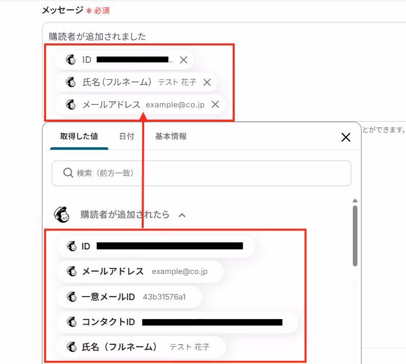 「メッセージ」は、入力欄をクリックして表示される、取得した値などから選択してください。