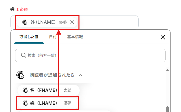 ※ 取得した値を使用せずに固定テキストで設定してしまうと、フローが稼働する度に同じ顧客情報が追加されてしまうためご注意ください。