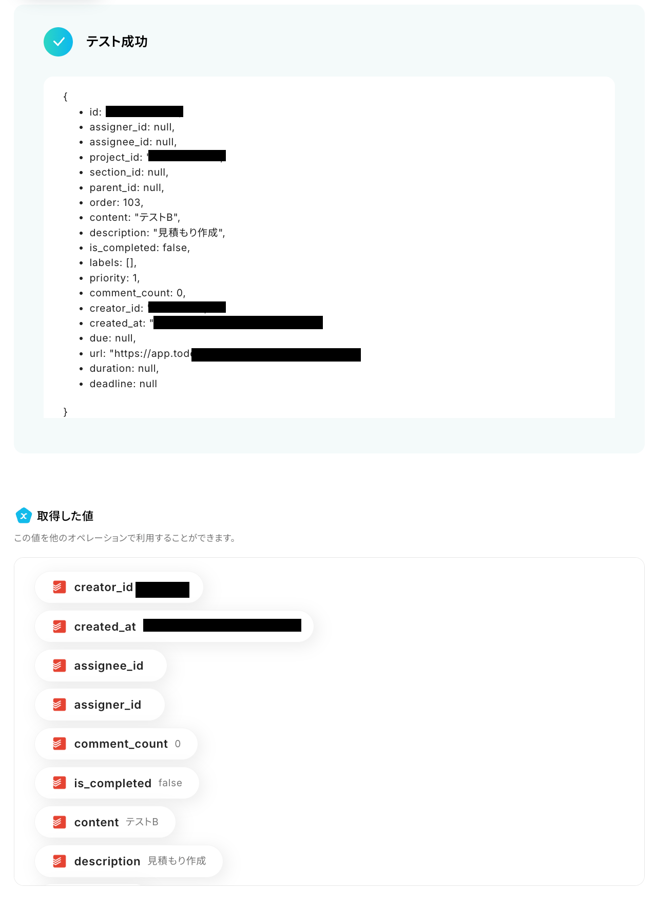 最後に取得した値を利用して、Todoistにタスク作成する設定を行います。