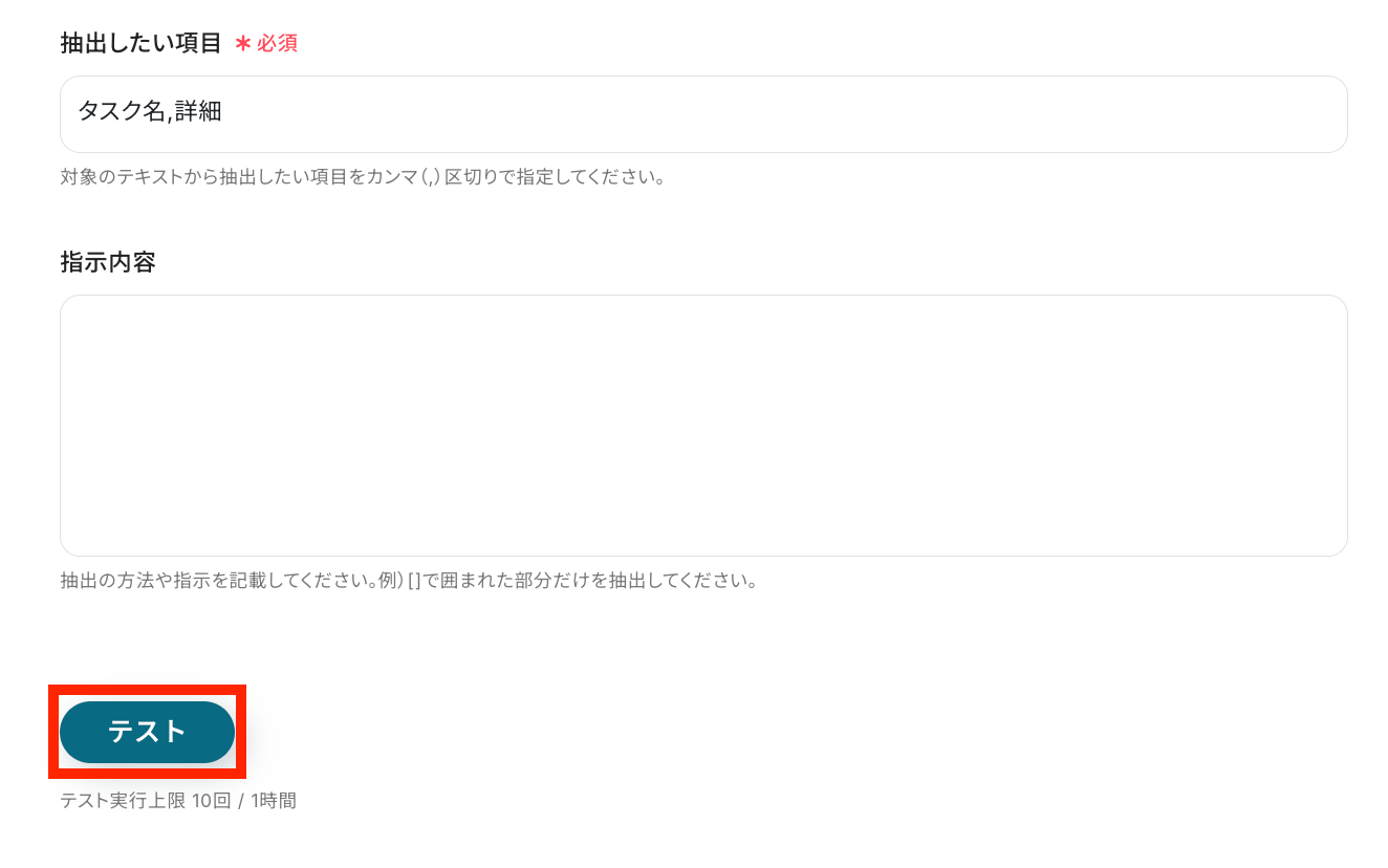 抽出したい項目を手動で設定したら、任意で指示内容を加え、「テスト」ボタンを押しましょう!