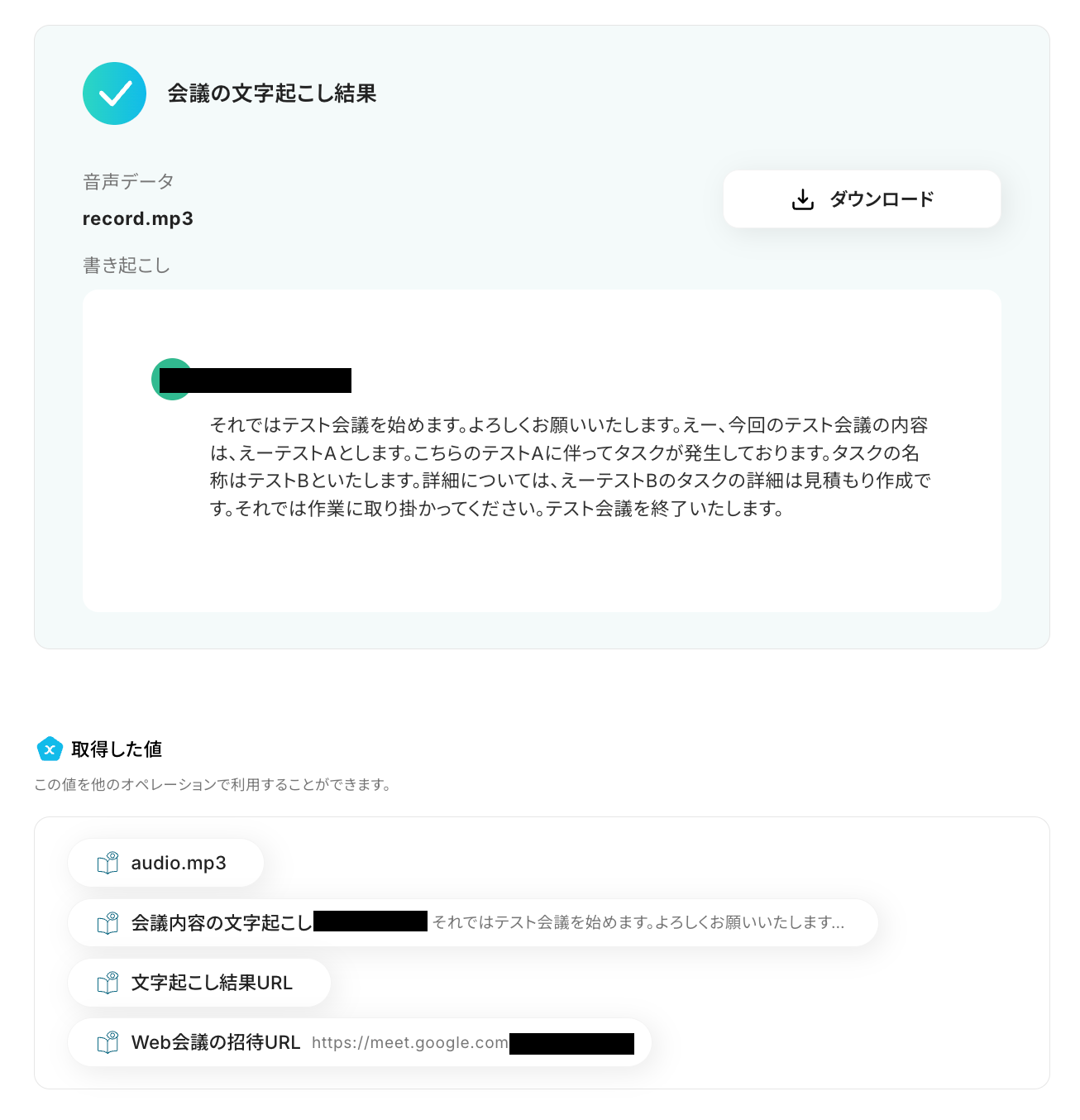 文字起こし結果と取得した値が確認できたら、「保存する」ボタンを押しておきましょう!