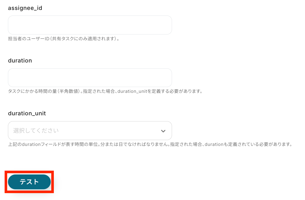 Todoistのアクション設定をする際に、「due_date」や「assignee_id」を設定して活用ください。