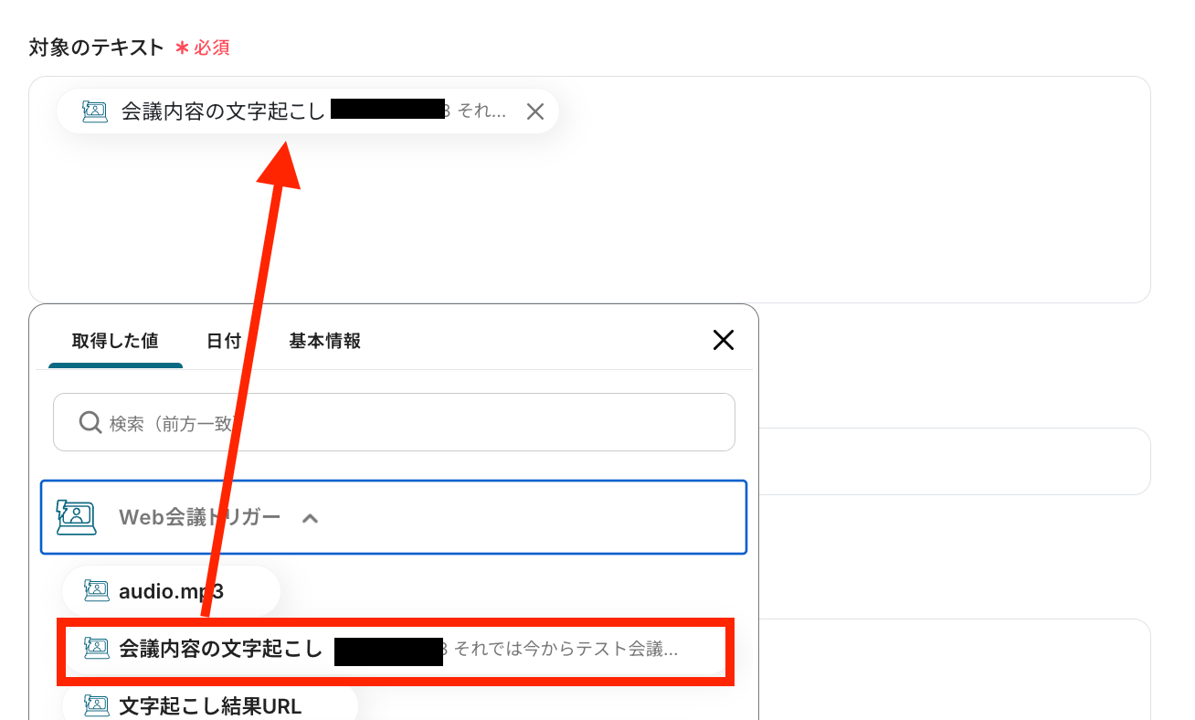 Web会議トリガーで取得した値を利用してテキストを抽出する設定を行います。