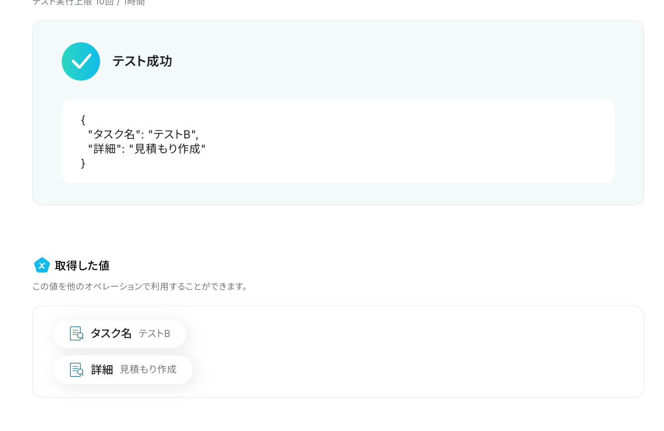 テスト成功で、抽出された項目が取得した値に反映されています。
