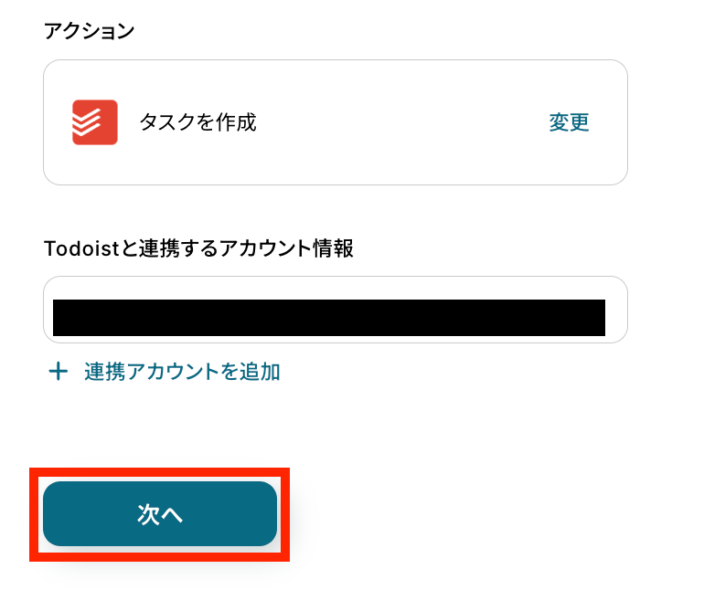 アクションはそのままで、Todoistと連携するアカウント情報を確認します。