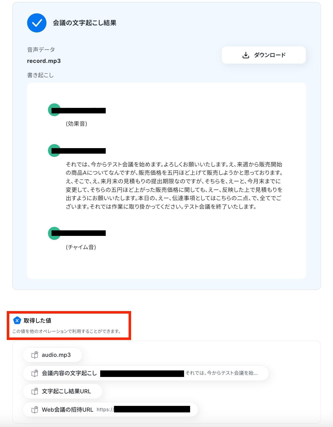 文字起こし結果と取得した値が確認できたら、「完了」ボタンを押しておきましょう!