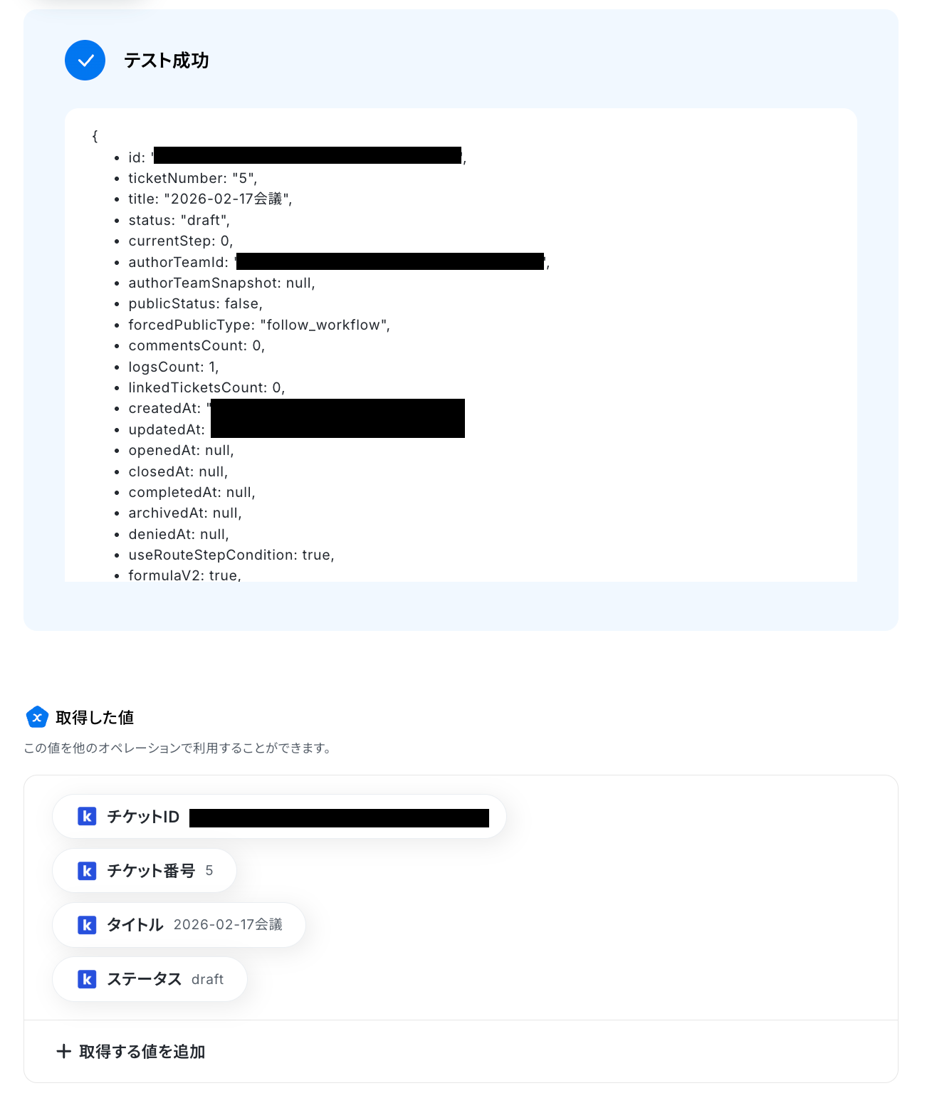 テスト成功という表記が確認できたら、kickflowでチケットが作成されています。