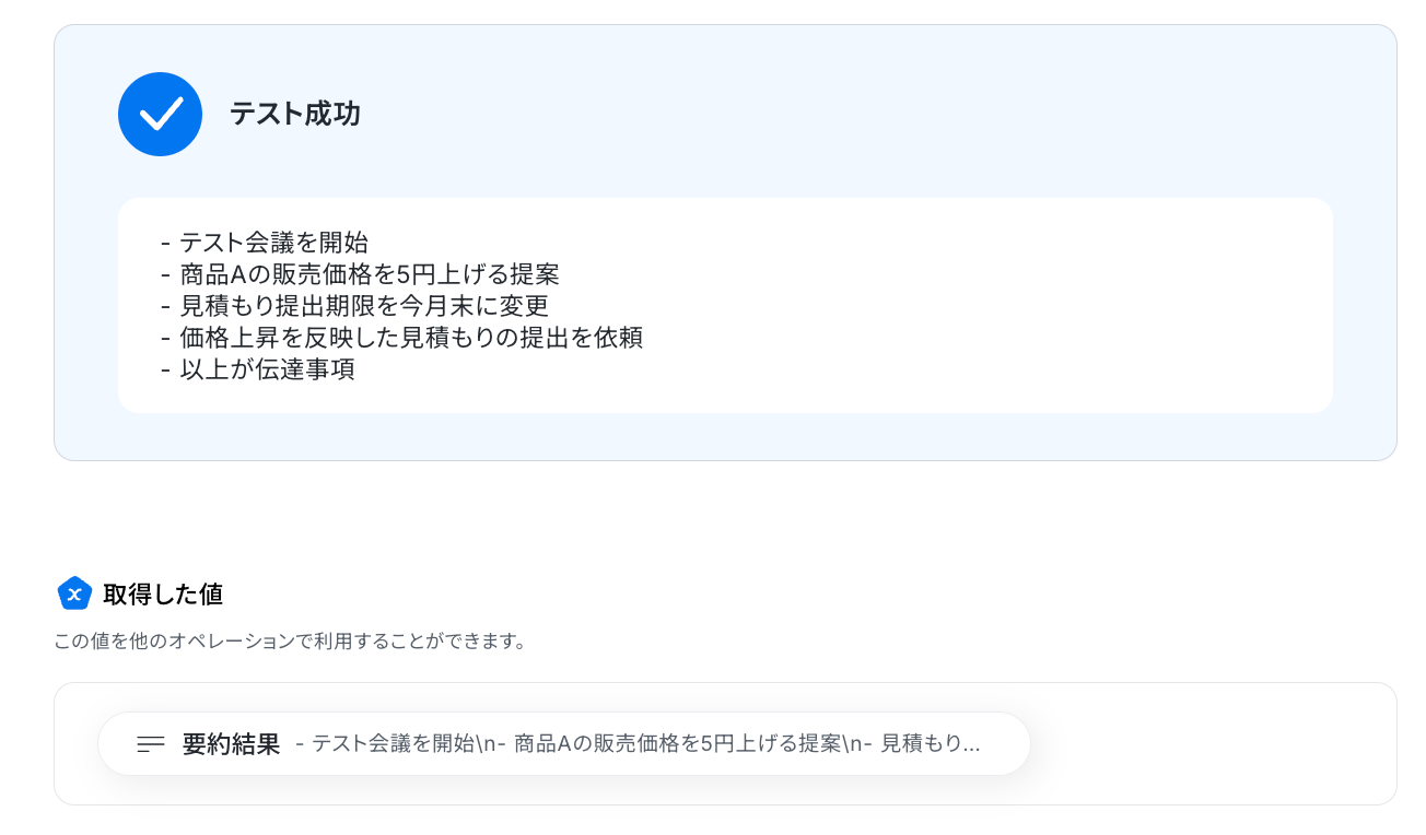 「テスト成功」と表示がされたら、抽出された項目が取得した値に反映されています。