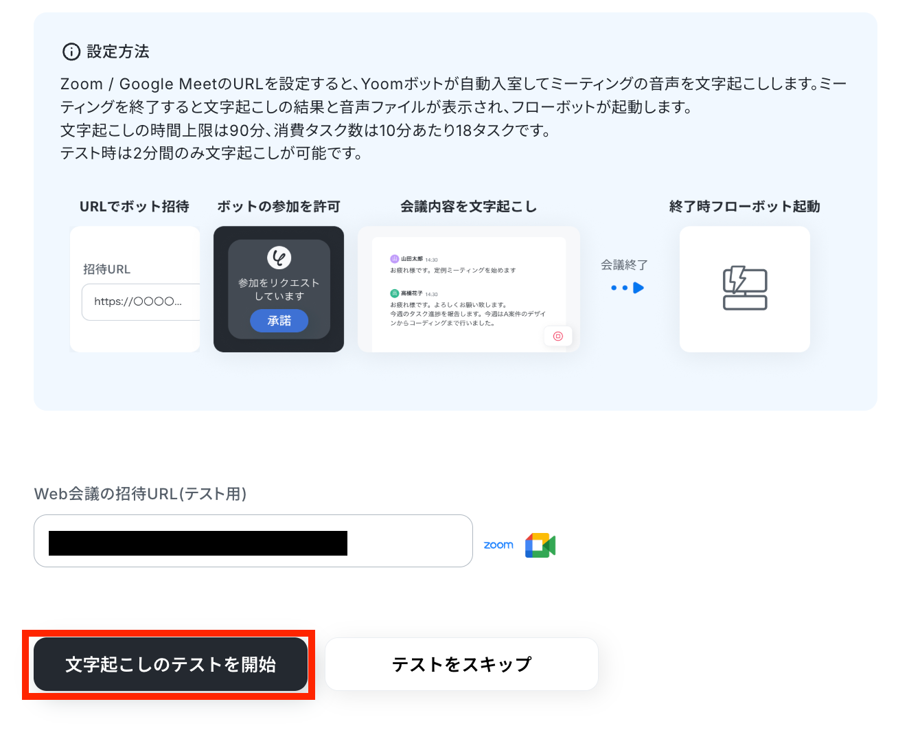 Yoomの設定に戻り、会議URLを登録して、「文字起こしのテストを開始」ボタンを押します。