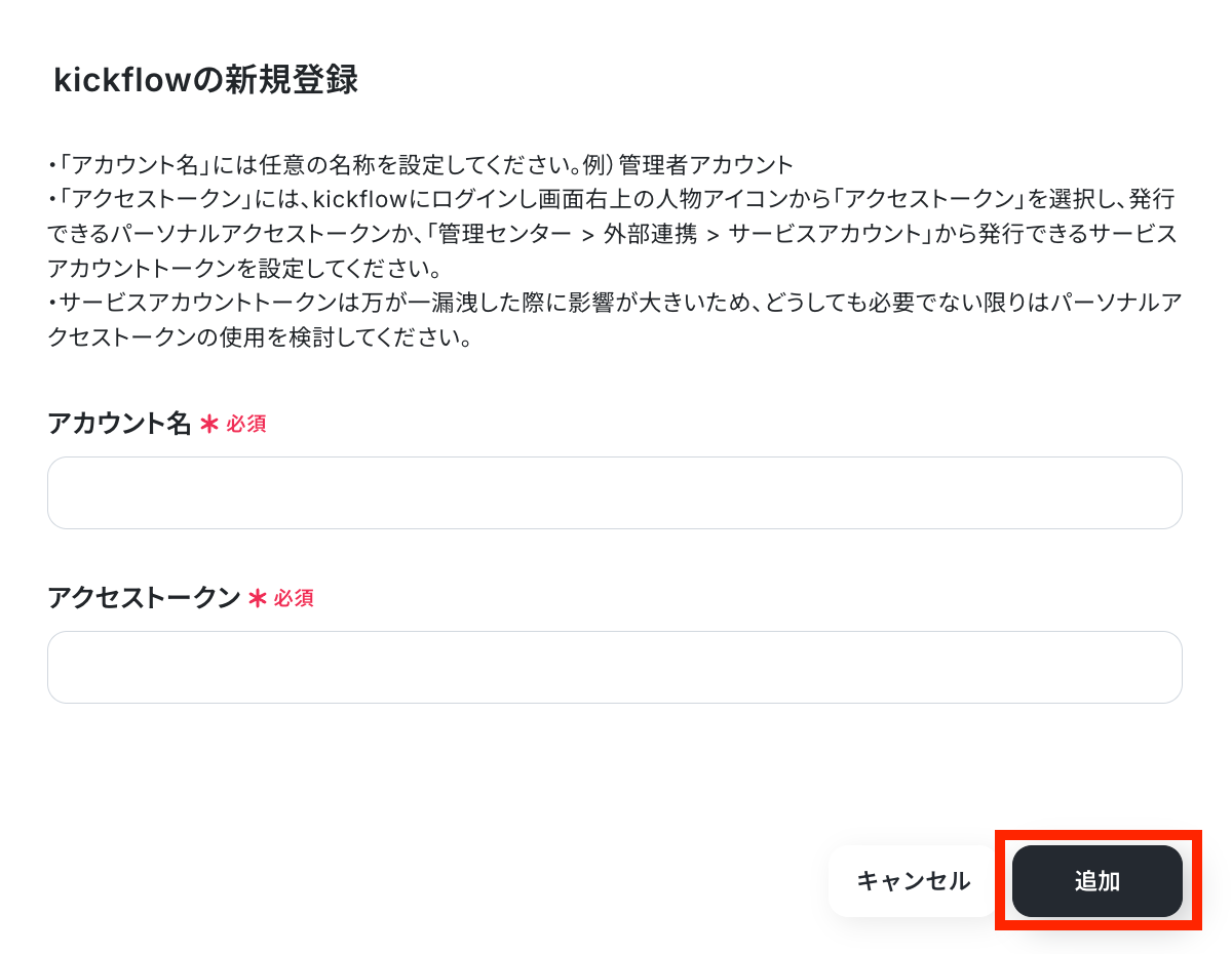 アカウント名とアクセストークンを記入して、「追加」ボタンをクリックしましょう!