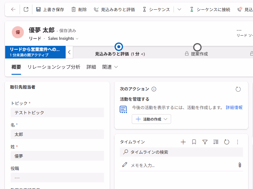 フローの作成を始める前に、あらかじめYoomと連携するMicrosoft Dynamics365 Salesに、リードを作成しておきましょう!