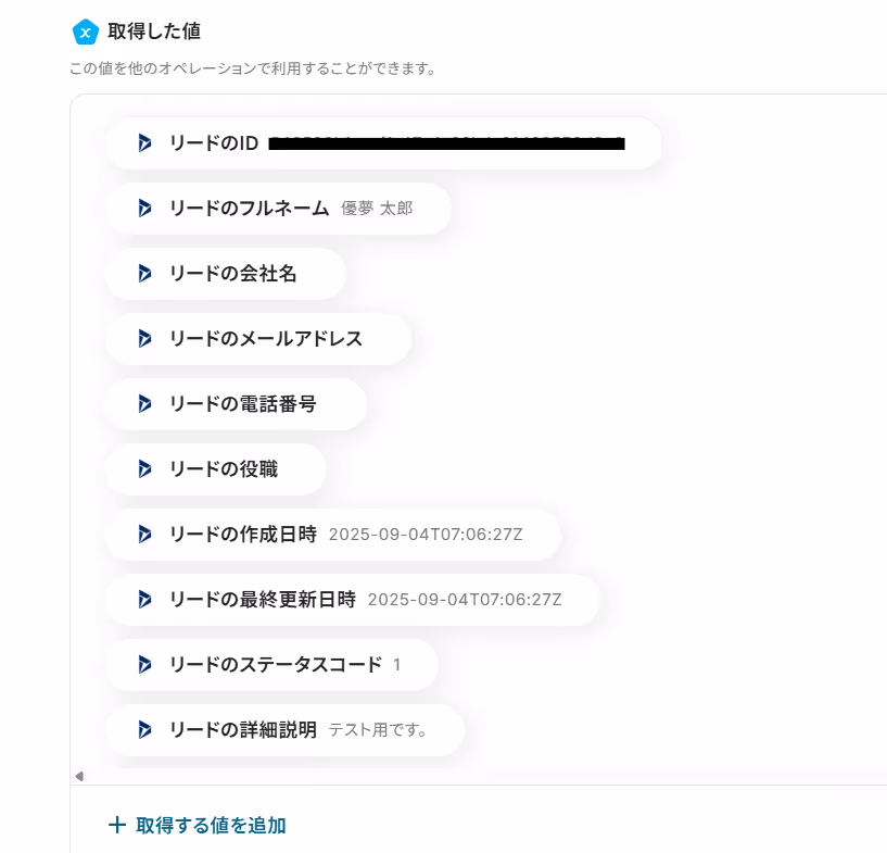 トリガーやオペレーション設定時に、「テスト」を実行して取得した値です。