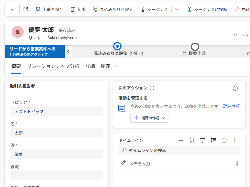 フローの作成を始める前に、あらかじめYoomと連携するMicrosoft Dynamics365 Salesに、リードを作成しておきましょう! ※後続のMicrosoft Dynamics365 Salesのトリガー設定時のテストで必要になります。
