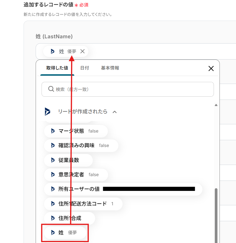 3.詳細設定を行います。 「追加するレコードの値」 の各項目は、入力欄をクリックして表示される取得した値から選択してください。 取得した値を活用することで、固定値ではなく、トリガーが実行されるたびに最新の情報が反映できます。 ※各項目は、データベース内の項目が表示されます。