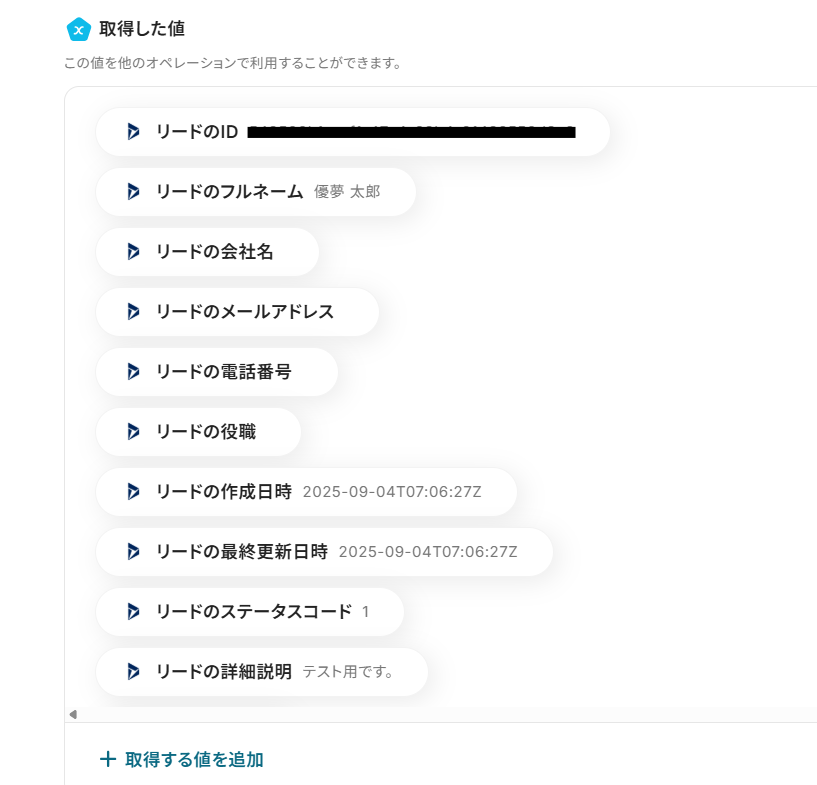 ※取得した値とは? トリガーやオペレーション設定時に、「テスト」を実行して取得した値です。 取得した値は、後続のオペレーション設定時の値としてご利用いただくことができ、フローボットを起動する度に、変動した値となります。 ※詳しくは、こちら をご参照ください。
