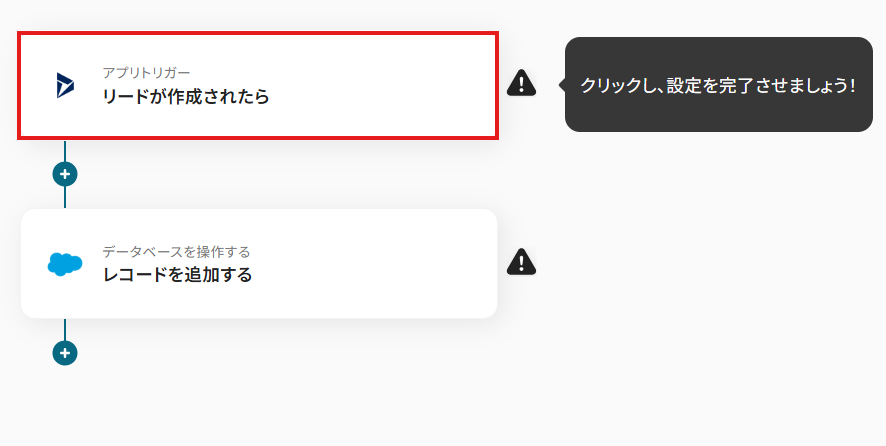 1.まずは、アプリトリガー設定です。 先ほどの画面で「OK」をクリックして、表示された画面のアプリトリガー「リードが作成されたら 」をクリックしましょう。