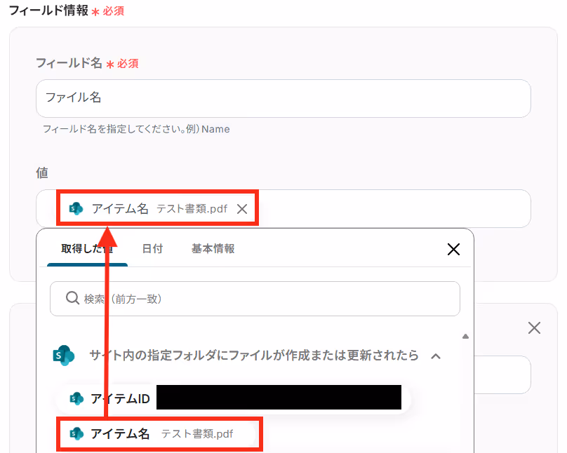 「値」は「取得した値」を使用可能です。「取得した値」は変数となるので、Microsoft SharePointでサイト内の指定フォルダにファイルが作成される度にそのデータを活用可能になります!