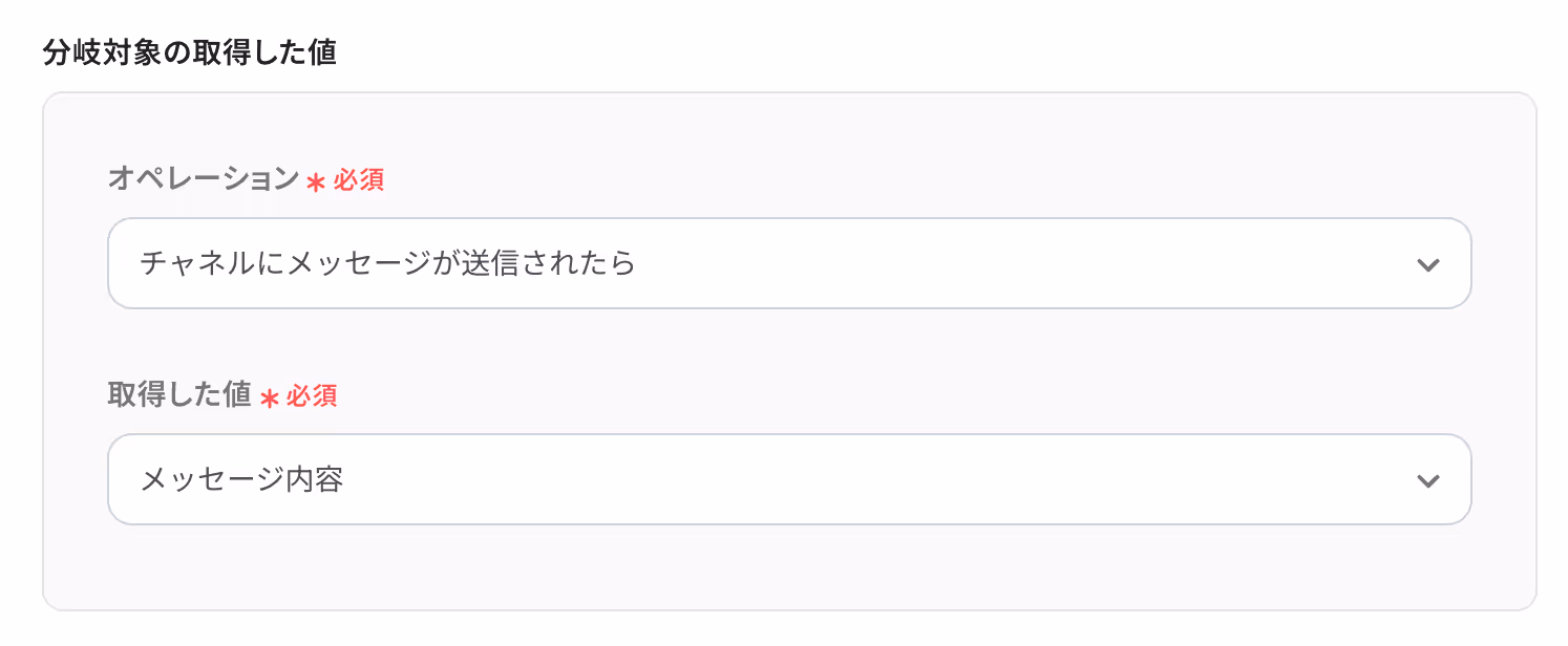 オペレーションは「チャネルにメッセージが送信されたら」、取得した値に「メッセージ内容」を選択