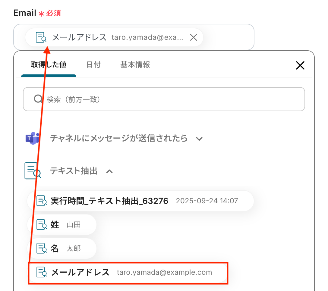 入力欄をクリックすると、前のステップでMicrosoft Teamsから取得した値が表示されるので、選択して入力しましょう。