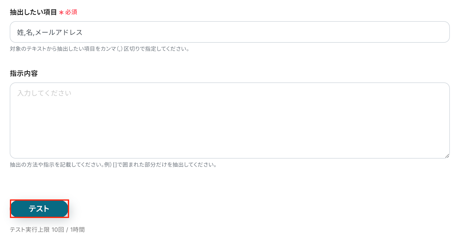 入力が完了したら、設定した項目が実際に正しく抽出されるかどうかを確認するため「テスト」をクリックしましょう。