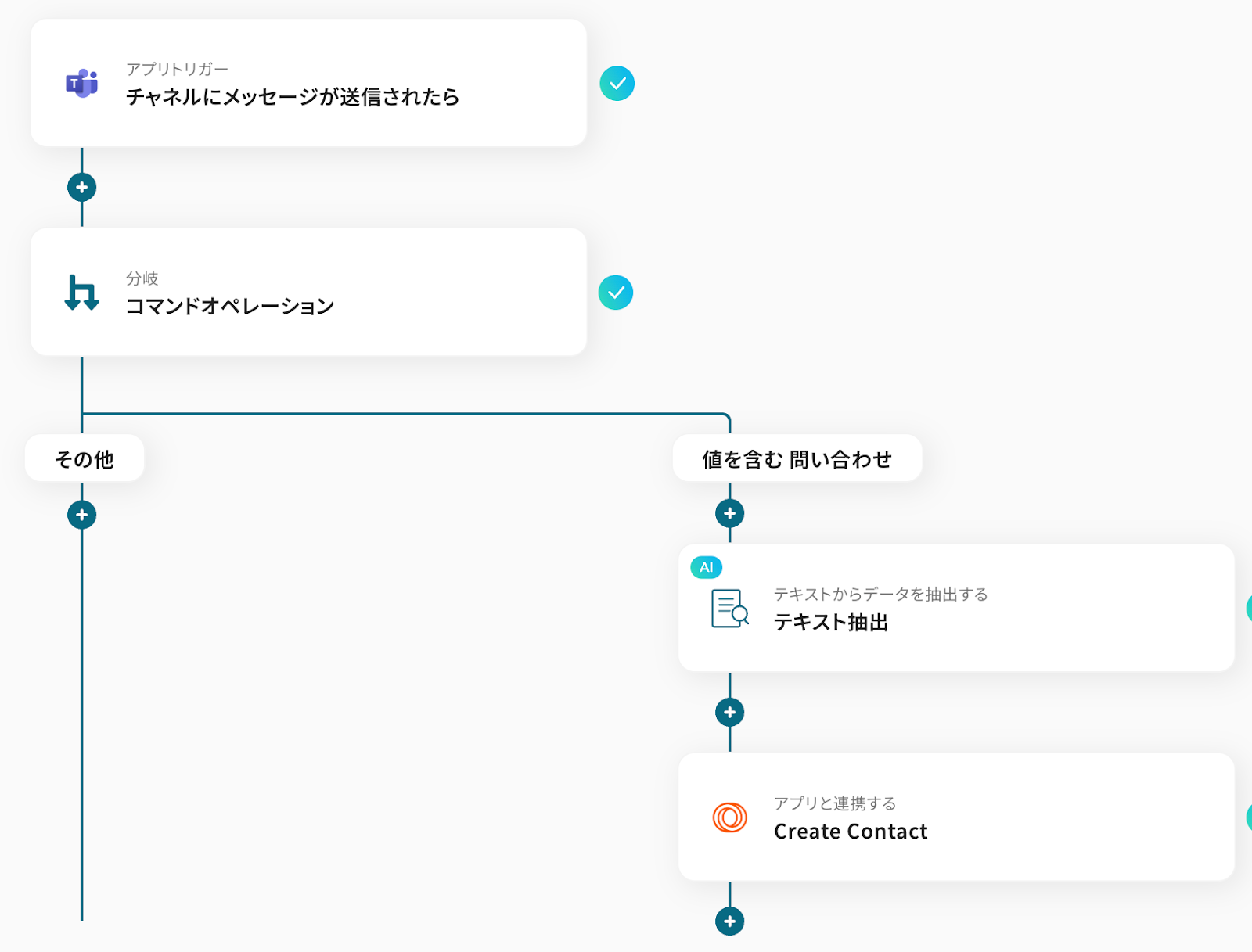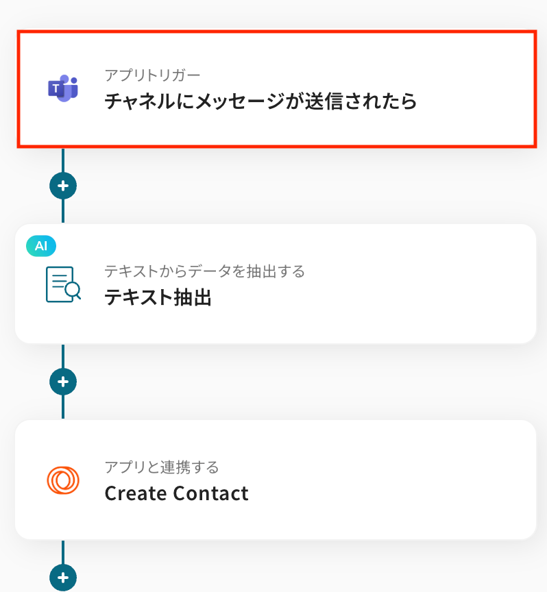 例えば、Microsoft Teamsで受け取った特定のメッセージ情報をトリガーにして、Loopsに新しいコンタクトを自動で作成するといった処理が実現できます。