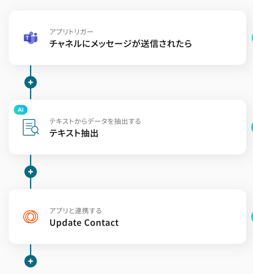 この自動化は、メッセージから必要な情報だけを抽出して連携する処理を含んでいるため、柔軟なデータ連携が可能です。