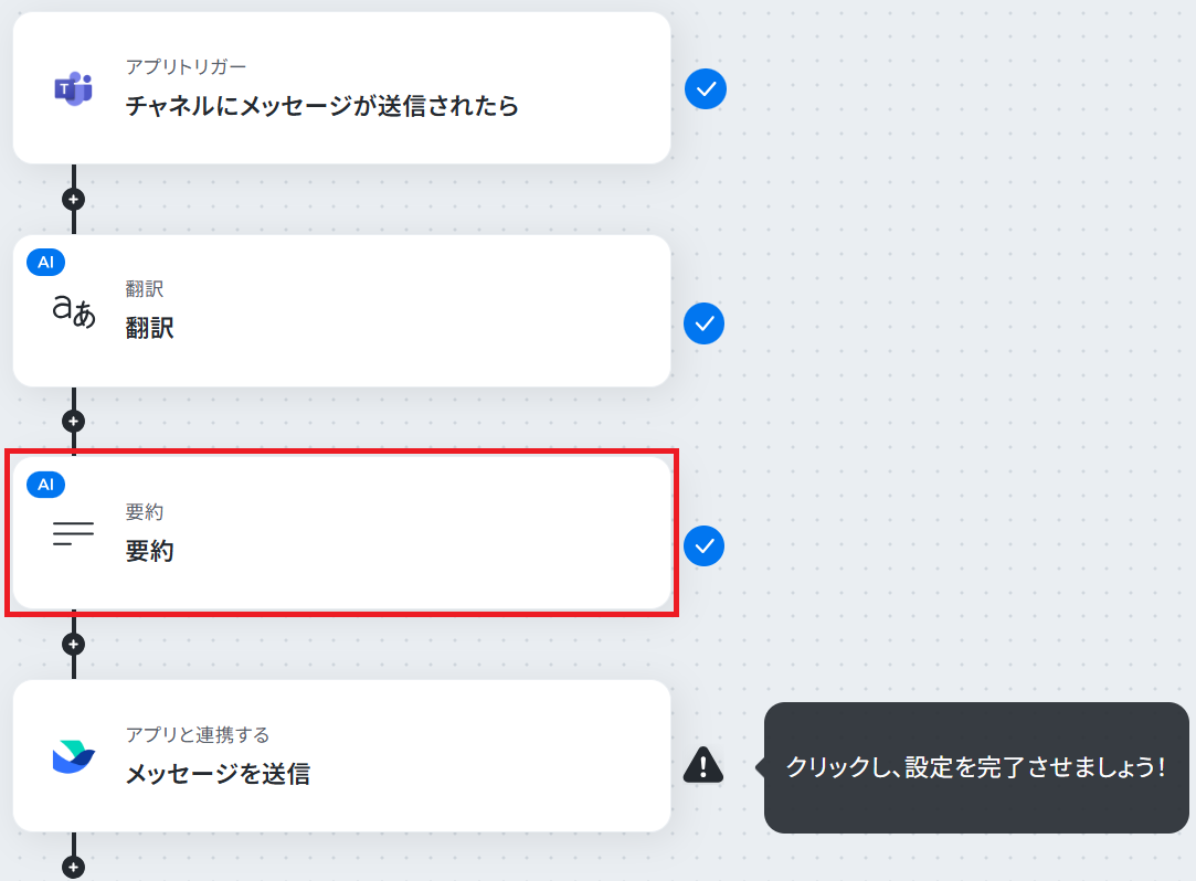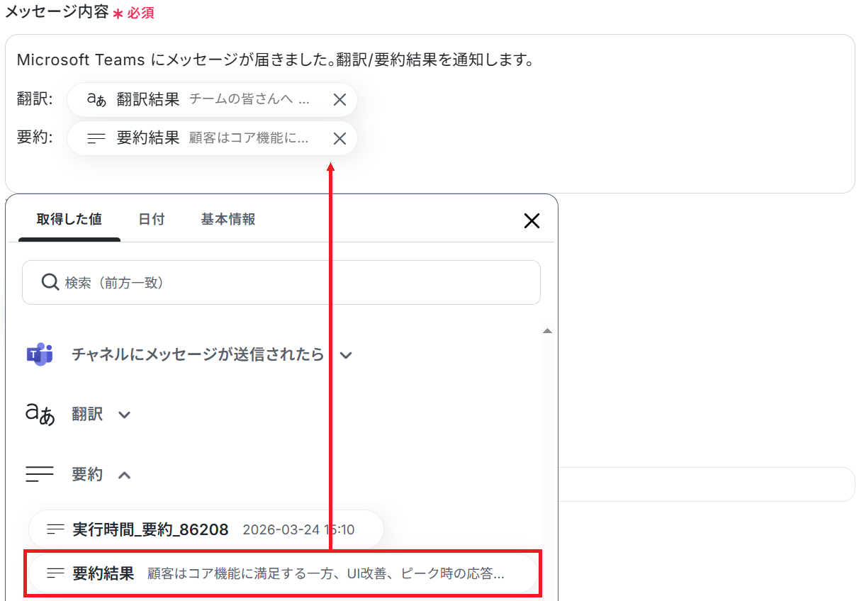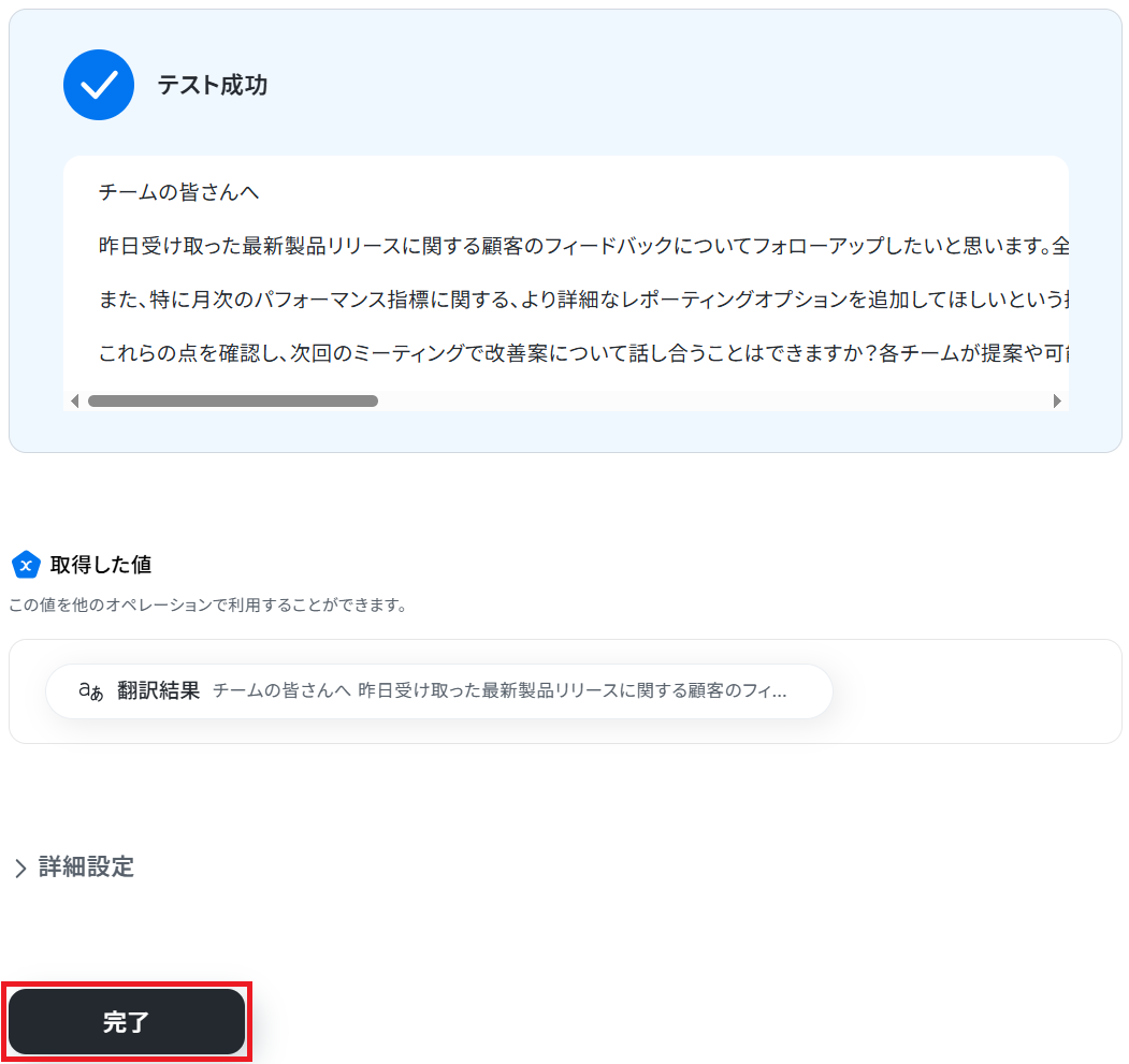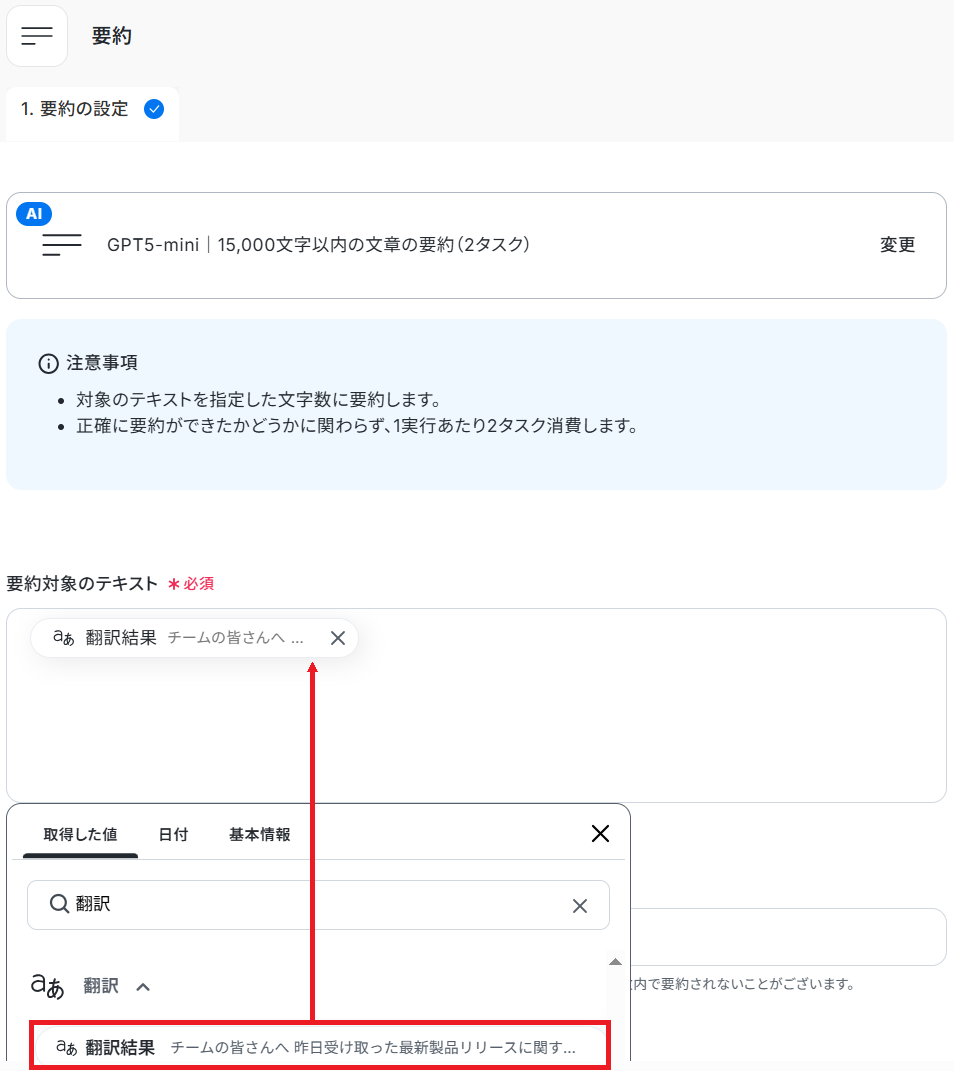要約対象のテキスト には、ステップ4と同じく翻訳機能から取得した「翻訳結果」の値が既に設定されているのでそのままでOKです。