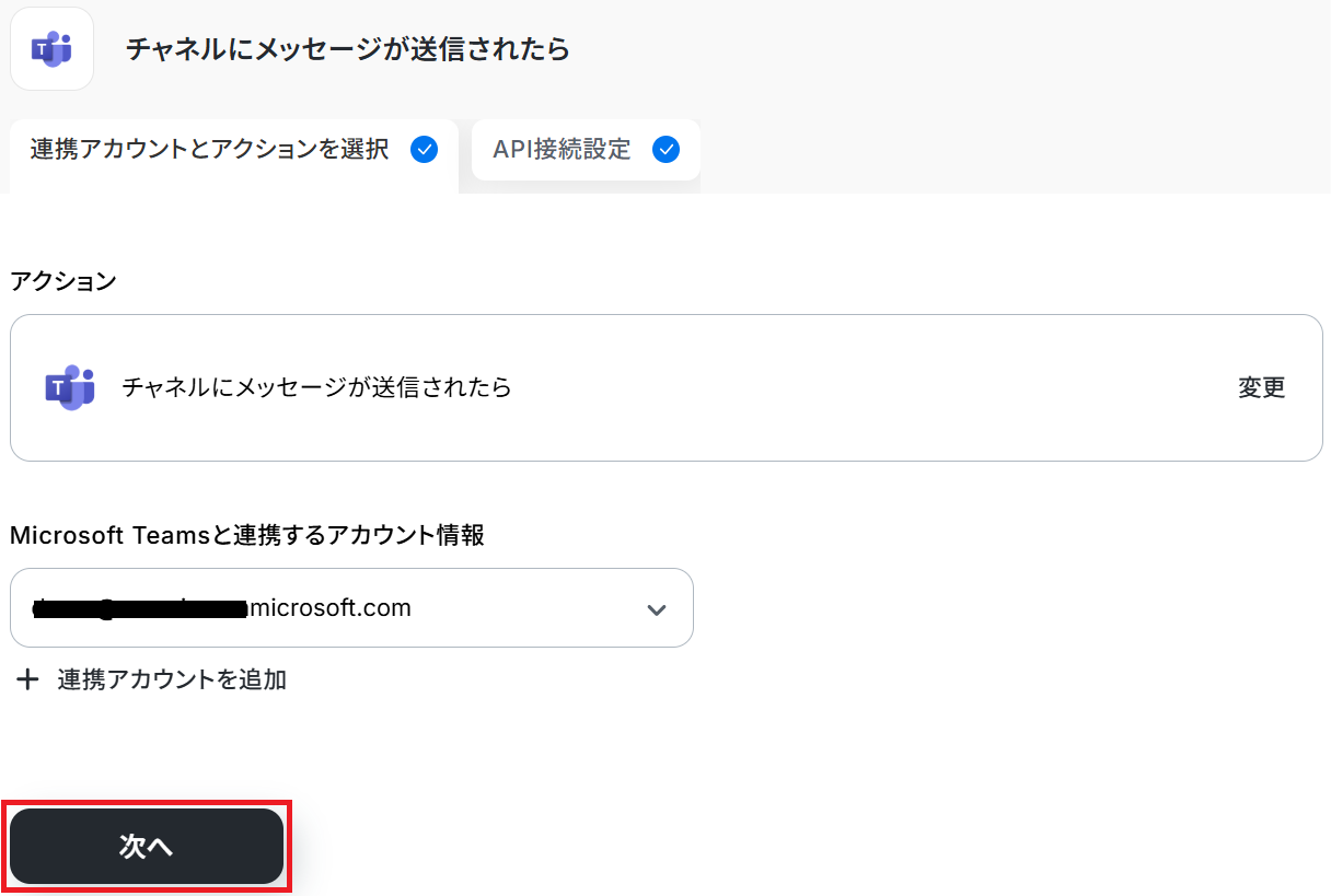 タイトル と連携するアカウント情報 を任意で設定し、アクションはテンプレート通りに「チャネルにメッセージが送信されたら」のまま「次へ」をクリックします。