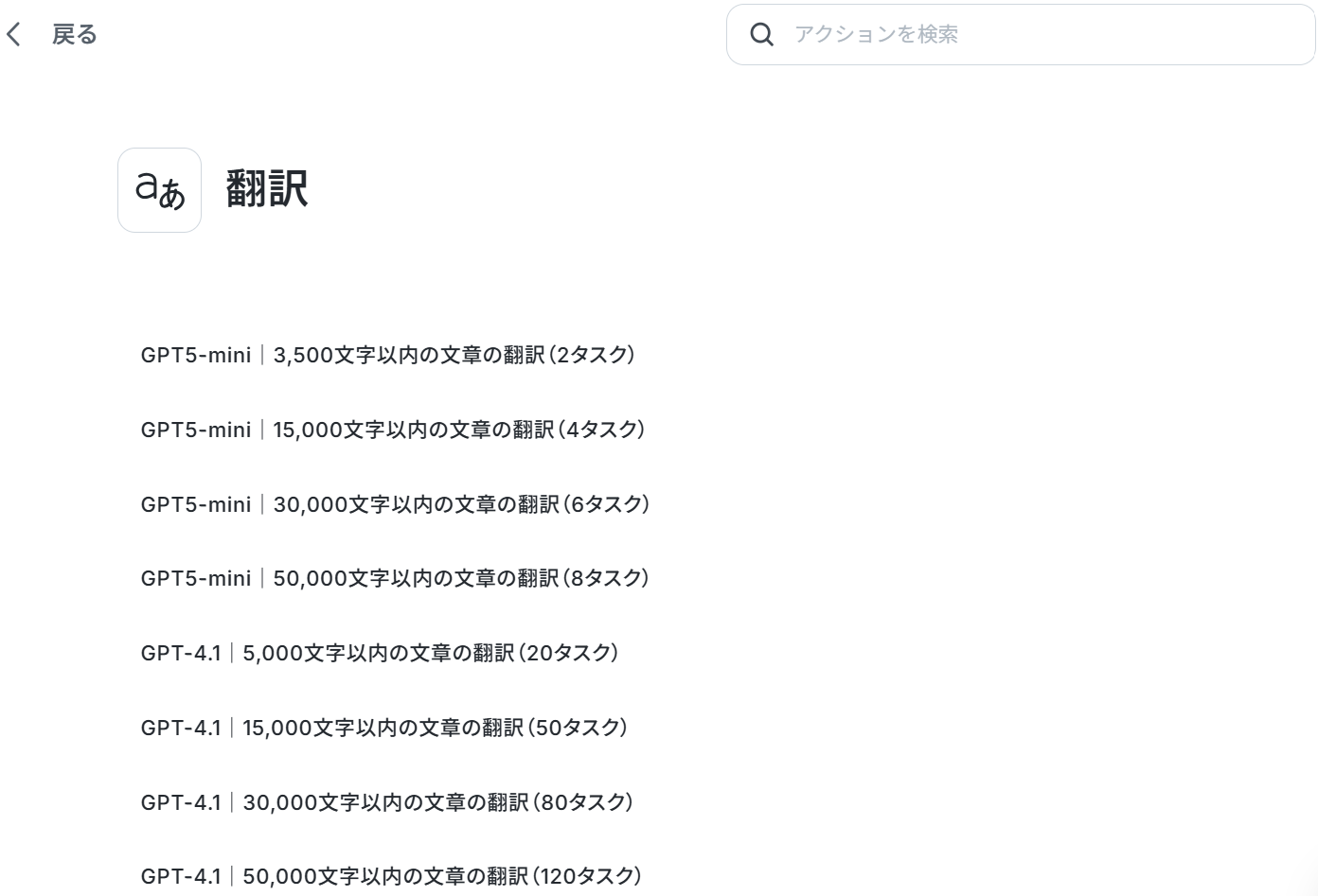 翻訳アクションは以下のような種類がありますので、用途に合わせて選択しましょう。 それぞれ()内のタスクを消費しますので、使用プランやデータの容量にご注意ください。