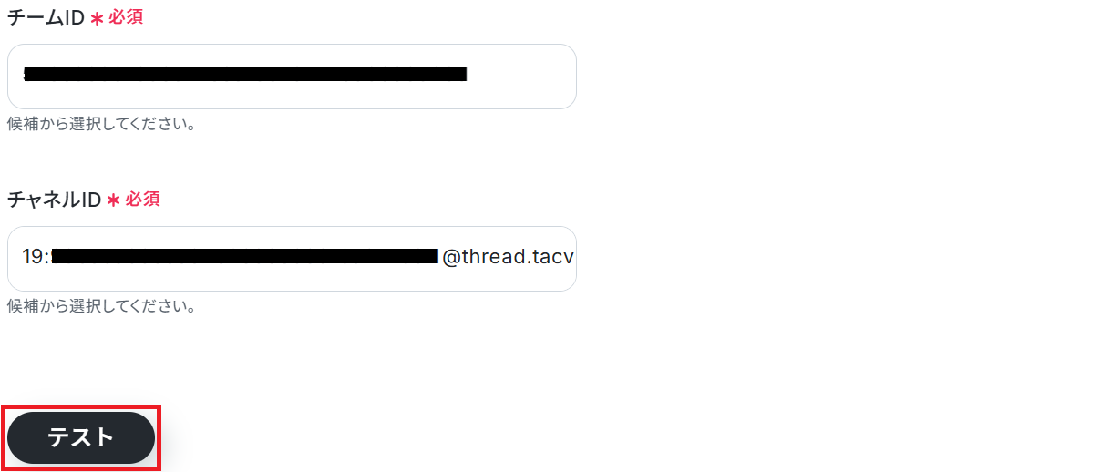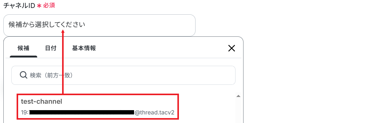 チームIDを選択すると、その下のチャネルID 候補が表示されるようになります。 投稿するチャネルを選択しましょう。