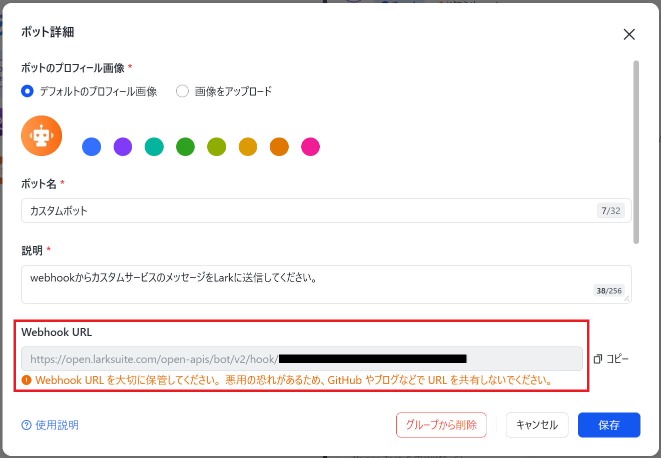 まずAdd a custom bot to the group を参考にWebhook URL を取得し、入力しましょう。