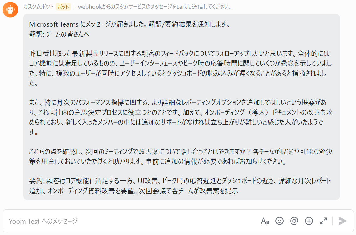 もしMicrosoft Teamsに投稿された外国語のメッセージをAIが翻訳・要約し、Larkに自動通知する仕組み があればこれらの悩みから解放されますね。 これにより海外とのコミュニケーションを円滑に進めながら、より重要な業務に集中する時間を生み出せるでしょう。