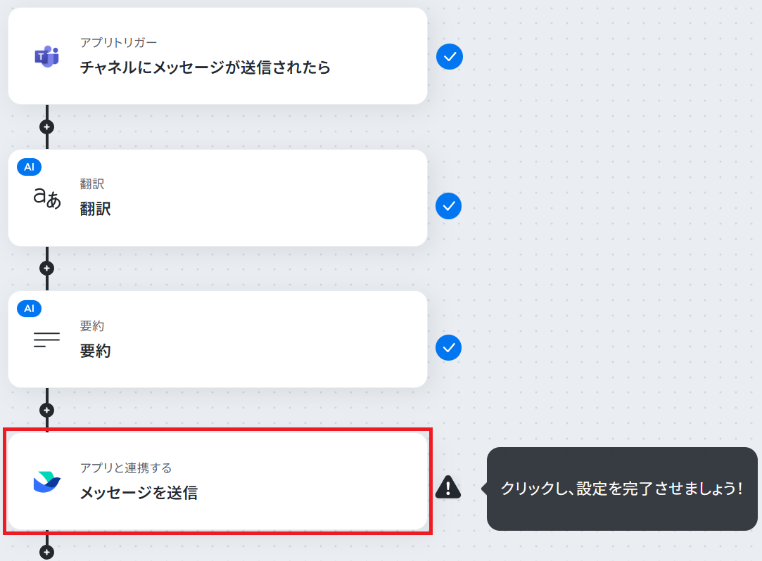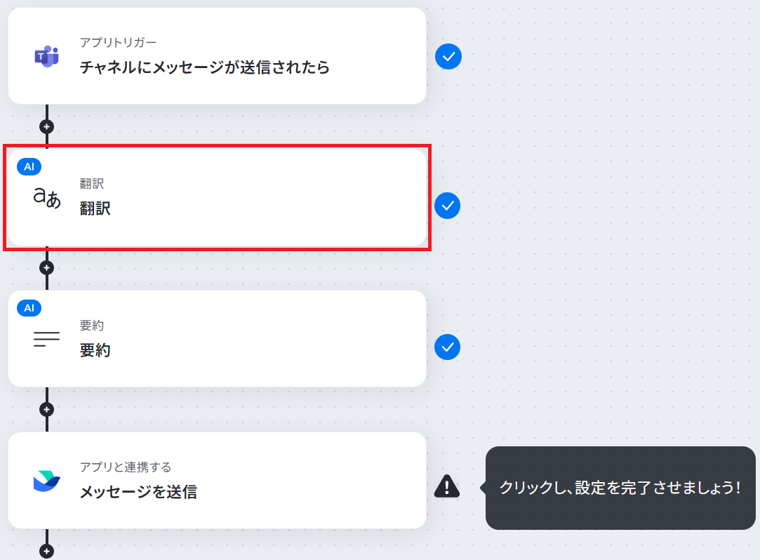 フローの作成方法 今回はMicrosoft Teamsに外国語のメッセージが届いたら、AIで翻訳・要約してLarkに通知する フローを作成していきます!作成の流れは大きく分けて以下の通りです。