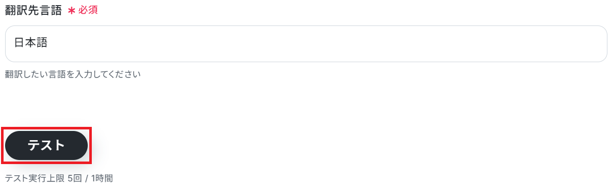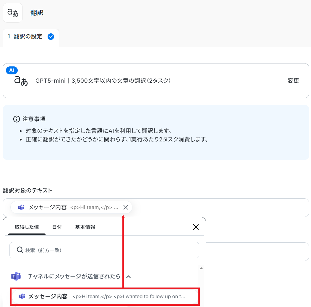 翻訳対象のテキスト の欄には、Microsoft Teamsから取得した「メッセージ内容」の値が予め設定されているのでそのままで大丈夫です。