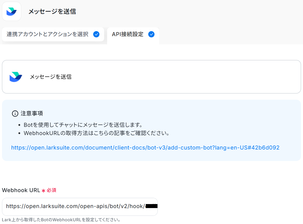 AI機能でテキストを生成するアクションでは、問い合わせの優先度をどのように判定させたいか、具体的な指示(プロンプト)を任意で設定してください。例えば、「緊急」や「至急」といったキーワードに応じて優先度を「高」と判定する、といったルールを指定できます。 Larkへメッセージを送信するアクションでは、任意のBotのWebhook URLを設定してください。 ■注意事項