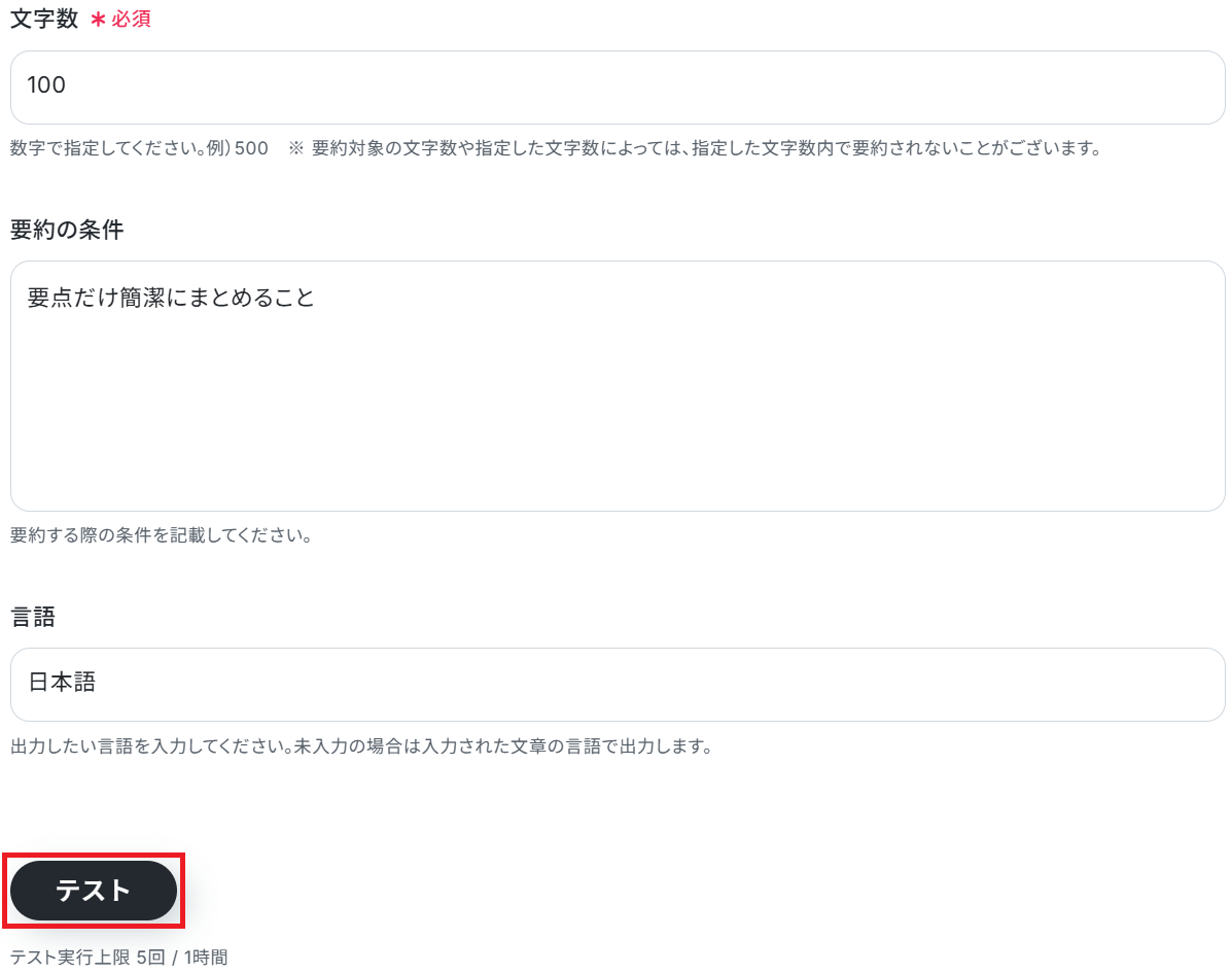 要約結果の文字数 と、任意で要約の条件 ・言語 を入力しテストしてください。