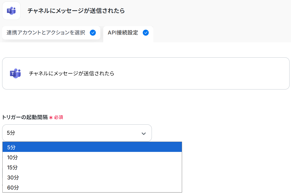 ※トリガーの起動タイミングは、5分、10分、15分、30分、60分のいずれかで設定できます。ご利用プラン によって、設定できるトリガーの最短間隔が違うので、その点は要チェックです。なお、基本的にはそのプランの最短の起動間隔にしてお使いいただくことをおすすめします。