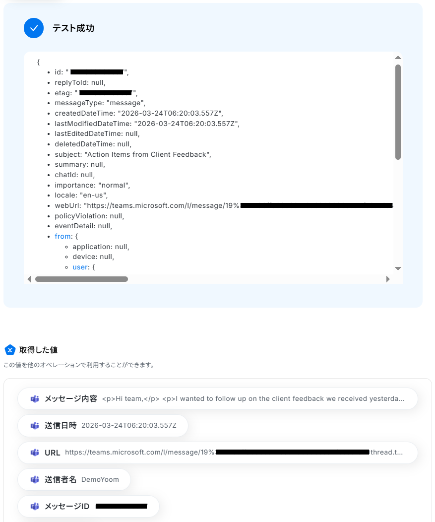 Microsoft Teamsのトリガー設定では、通知を監視したい任意のチームIDおよびチャネルIDを設定してください。これにより、特定のチャネルに投稿されたメッセージのみを自動化の対象とすることができます。 ■注意事項