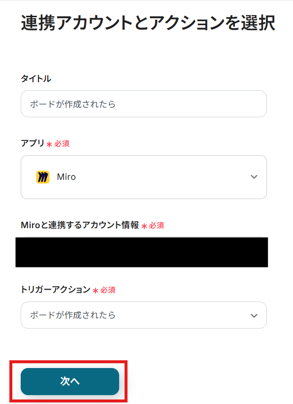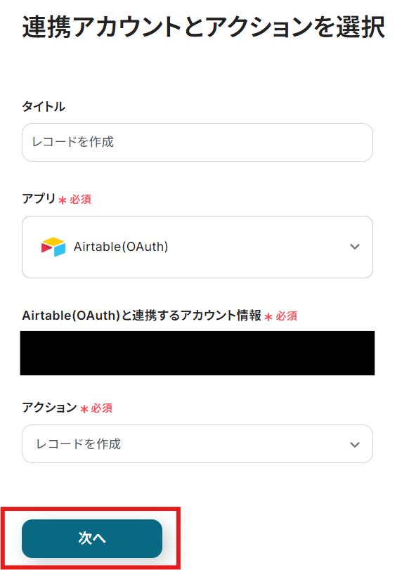 タイトルと連携するアカウント情報を確認し、アクションはテンプレート通りのまま「次へ」をクリックして進んでください。