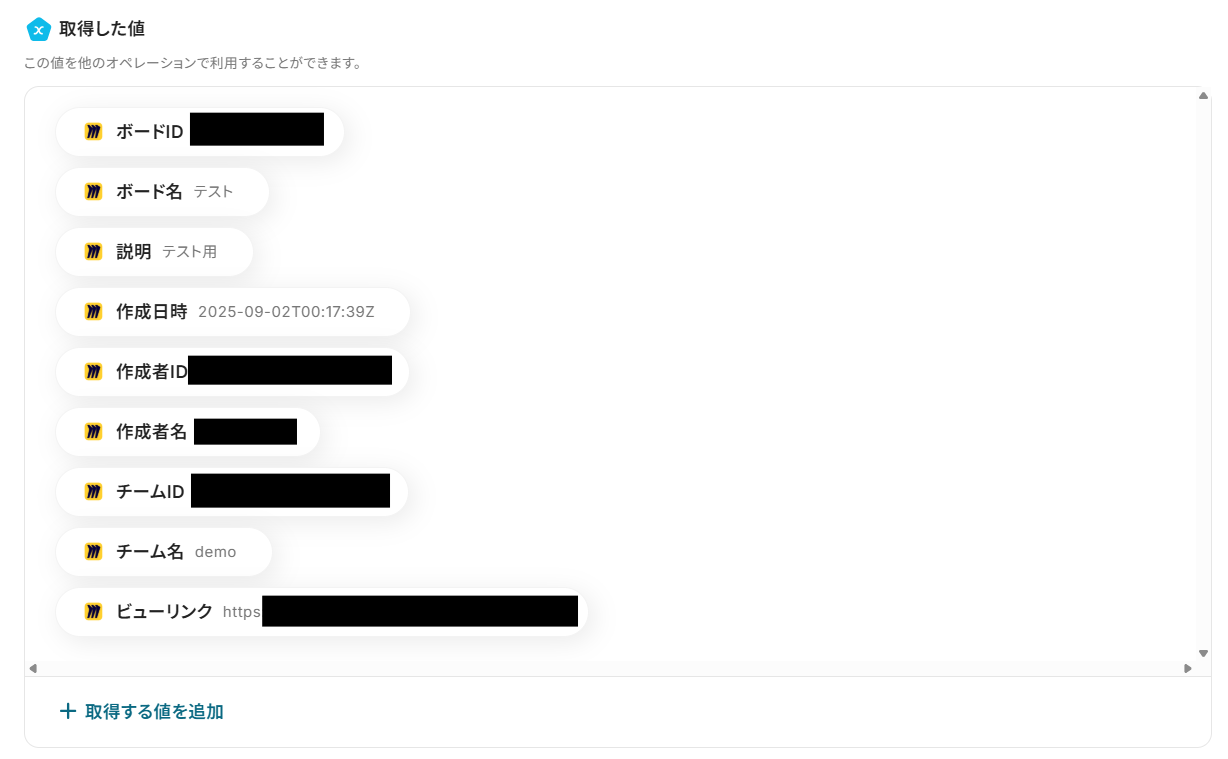 「取得した値」(アウトプット)は変数となるため、Miroでボードが作成される度に活用できます!