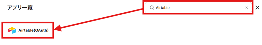 「新規接続」を選択すると「アプリ一覧」が表示されます。Airtableを検索して選択しましょう。