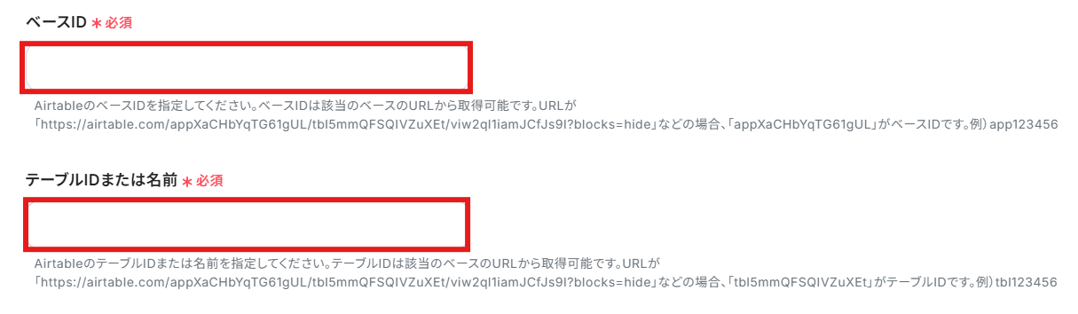 「ベースID」と「テーブルIDまたは名前」を注釈に沿って設定しましょう。