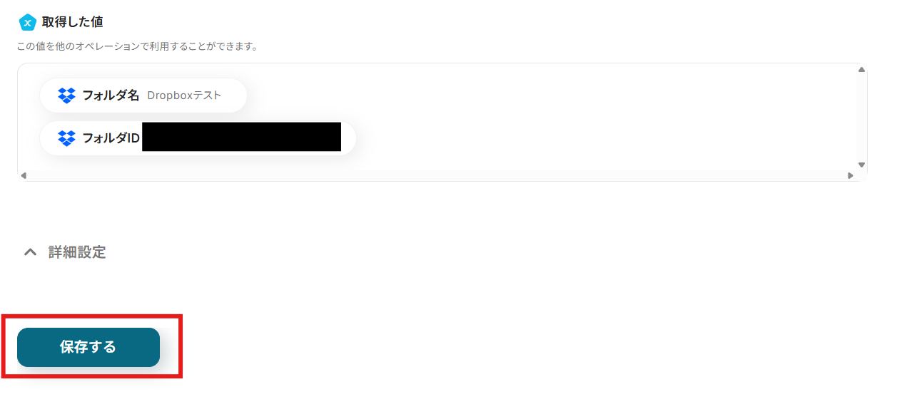 例えば、Dropboxに既にある「test」というフォルダ内の「test2」のフォルダにMiroの{{ボード名}}のフォルダを作成したい場合、「test/test2/{{ボード名}]」と設定することで実現できます。
