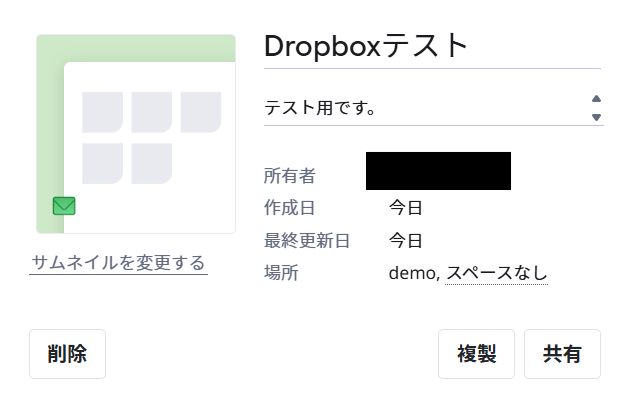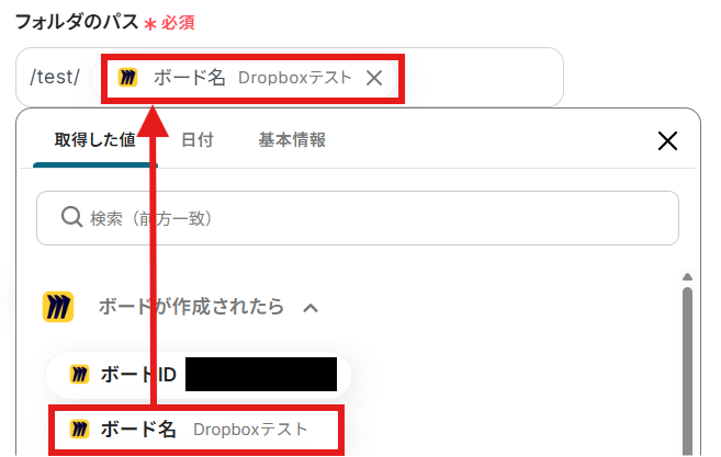 Dropboxにある「test」というフォルダ内に、{{ボード名}}のフォルダを作成するように設定しました!
