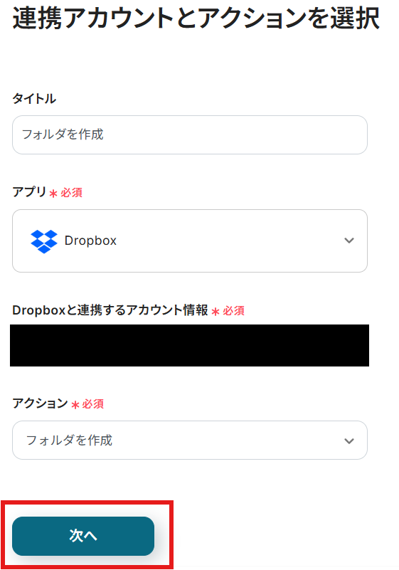 タイトルと連携するアカウント情報を確認し、アクションはテンプレート通りのまま「次へ」をクリックして進んでください。